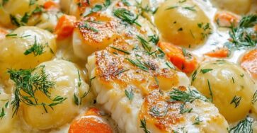Cassolette de Poisson à la Crème, Pommes de Terre et Légumes Fondants Cette cassolette de poisson à la crème avec…