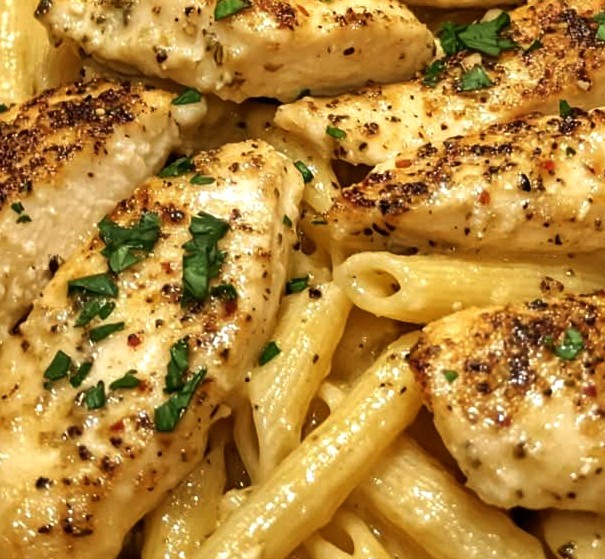 pâtes au poulet crème, pasta poulet ail parmesan, recette pâtes crémeuses, pâtes italiennes faciles, dîner rapide au poulet, recette pasta parmesan, one-pot pasta crémeux.