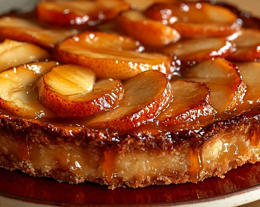 Tarte tatin aux poires : remplacez les pommes par des poires (même quantité) et réduisez la précuisson à 6–7 minutes.
